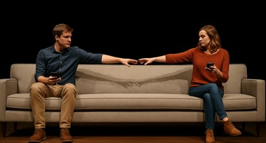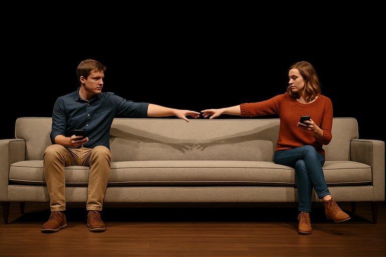 #Online, but not mine - We now switch across to focus on a couple who demonstrate the effects social media, and smart technology has on relationships. A husband and wife, who were together before the 'digital age' have now drifted apart physically and emotionally. He is being drawn in by Jonas' agenda, and will often sit alone in his office posting online. They are distally placed on the stage. A key element in this scene is as they both walk towards the (exagerated size sofa) their children appear from stage left and right. The parents are staring at their phones, and skirt round the children as they walk, they do not acknowledge them. The children look upset, and slowly wonder off stage.