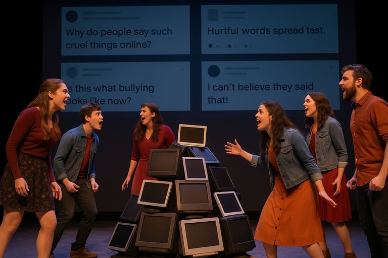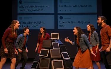 Echoes of us - This song opens act II, which heralds a more explicit examination of the human costs of social media. Dancers assume a position we see quite a lot in this show, facing each other across the stage. This time they cannot see each other, separated by a high mound of 'digital rubbish' monitors, tablet devices, keyboards, glued together. They sing through the mound. On the backing of the stage we see posts being shared showing examples of online bullying and shaming.