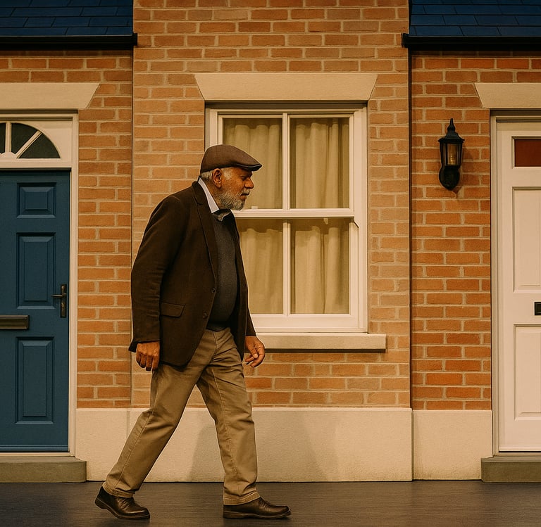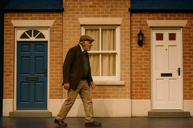 @Stanger on my street - The lowest emotional point in the show. This scene again zooms in on a particular sub-story. We meet Aziz, a retired secondary school teacher, of British-born Pakistani origin. He is known in his community for being a champion of young people. As the first Pakistani heritage town councillor he campaigned to have youth workers in the town years ago. He also tutored struggling students for free. He felt as British as any other member of the community. Before the song we see an acted scene played out where the character is walking down the street carrying two bags of shopping. A father and his teenage son, are walking in the opposite direction. The son knocks into Aziz, causing him to job his shopping. The young boy mutters "why don't you go home mate", his father, whilst knowing Aziz for some years and always being civil previously, stifles a snigger as they walk on without looking back. The song choreography is very stripped back. For the most part, it is Aziz wandering the street scene stage. He is joined by his wife in later parts of the song.