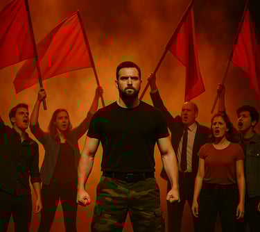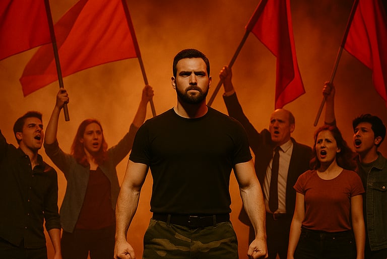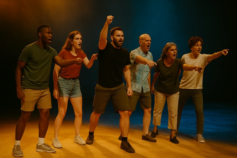 Raise the flag - Having established power, Back2Borders now allow, and entertain, a militant change in society. The boundaries between national pride and hate are too blurred for most to understand exactly what they are supporting, but are carried along with the crowd and social media hysteria. This scene has Jonas down amongst the crowd, wearing pseudo-military clothing, and stoking up movement. Dancers wave red flags. Fire-coloured lighting scheme.