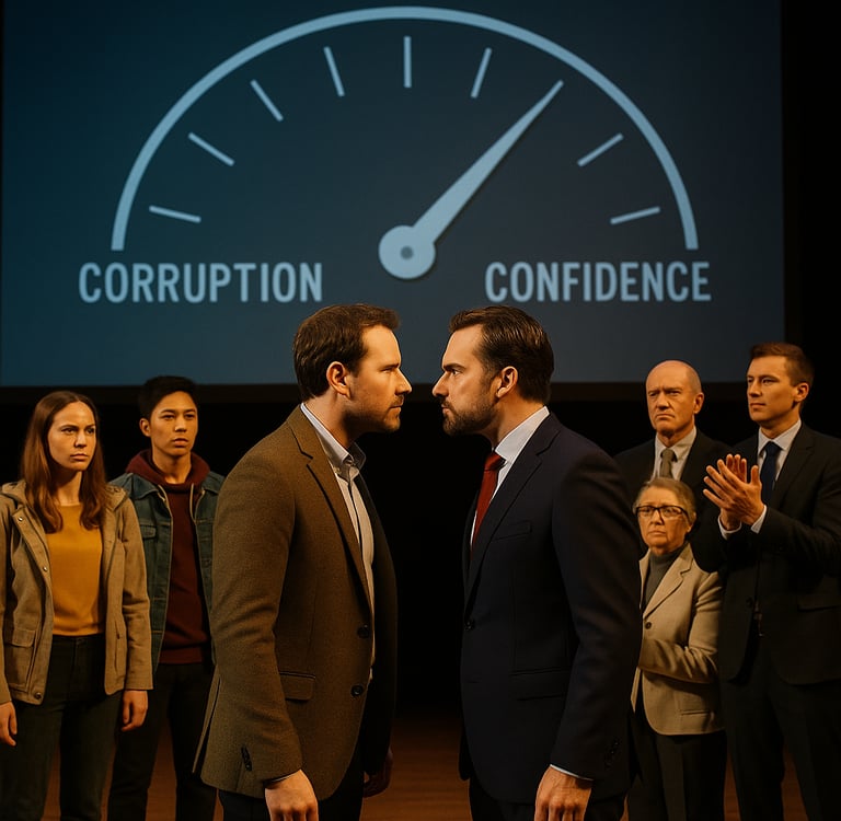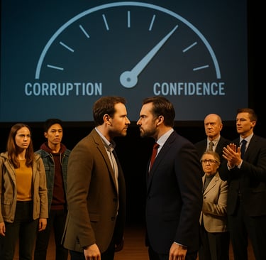 The mask slips - SysTmCRas# - This song sees the fall of Jonas and his Back2Borders movement. The stage sees Jonas and his followers, facing the citizens on the other, they also have a lead voice who stands slightly in front of their group, mirroring Jonas. There is a dial projected on the back screen, with confidence and corruption being the two extremes of the measure. The dial starts at confidence, and moves towards corruption as the song progresses. Whilst initially a balanced 'dance off', from the point the lyric "corruption rising" is heard, the citizen crowd begin to make ground, shift the Jonas group more towards the side of the stage, showing them being pushed out. By end of the song they are very pinched and clustered together.